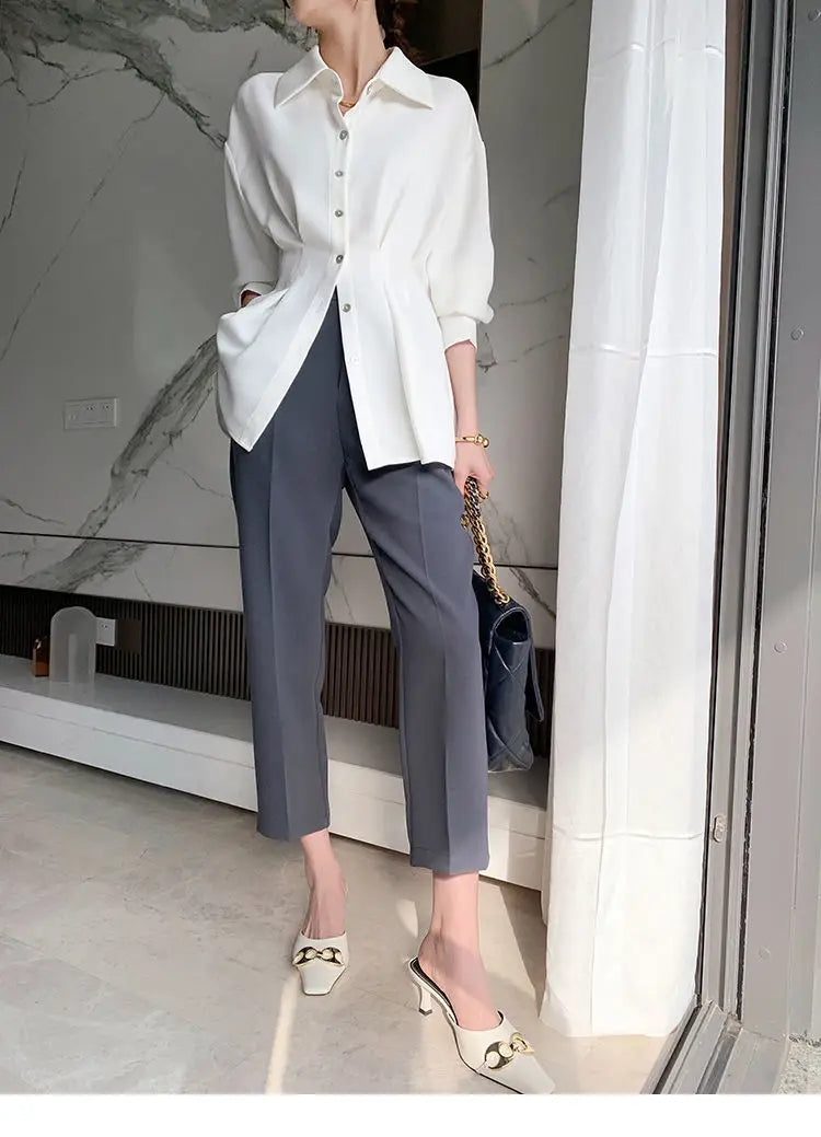 Office Lady Shirt 2021 Elegant Fashion Chiffon Blouse Long Sleeve Solid Color Pleated Slim Waist Collar Tops Temperament Clothes