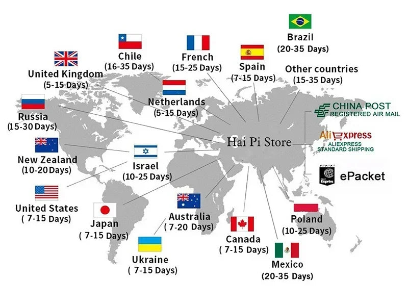 - International Shipping: Delivery times vary depending on the destination country.