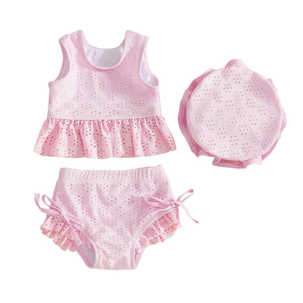 Toddler Kids Baby Girls Swimsuits Sleeveless Crew Neck Solid Color Eyelet Embroidery Tops Bikini Bottoms with Hats Swimwear