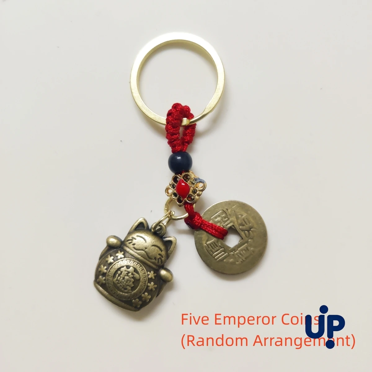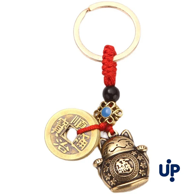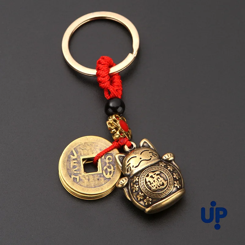 1Pc Vintage Pure Handmade Lucky Cat Car Keychain Lucky Cat Five Emperors Money Keychain Feng Shui Coins Solid Lucky Key Ring