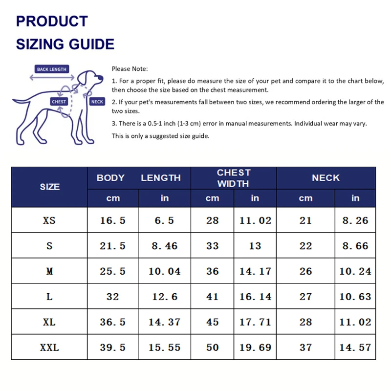 XSΒ Chest Girth 28cm/ 11.02'' ; BackΒ Length 16.5cm/ 6.5'' ; Neck Length 21cm/8.26'';