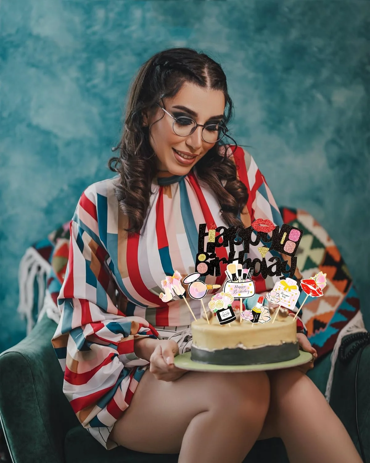 22PC Makeup Cake Toppers Kit - Lipstick, Perfume, Eyelash, Diamond Brush Decor for Women Girls Birthday Bridal Shower Spa Party