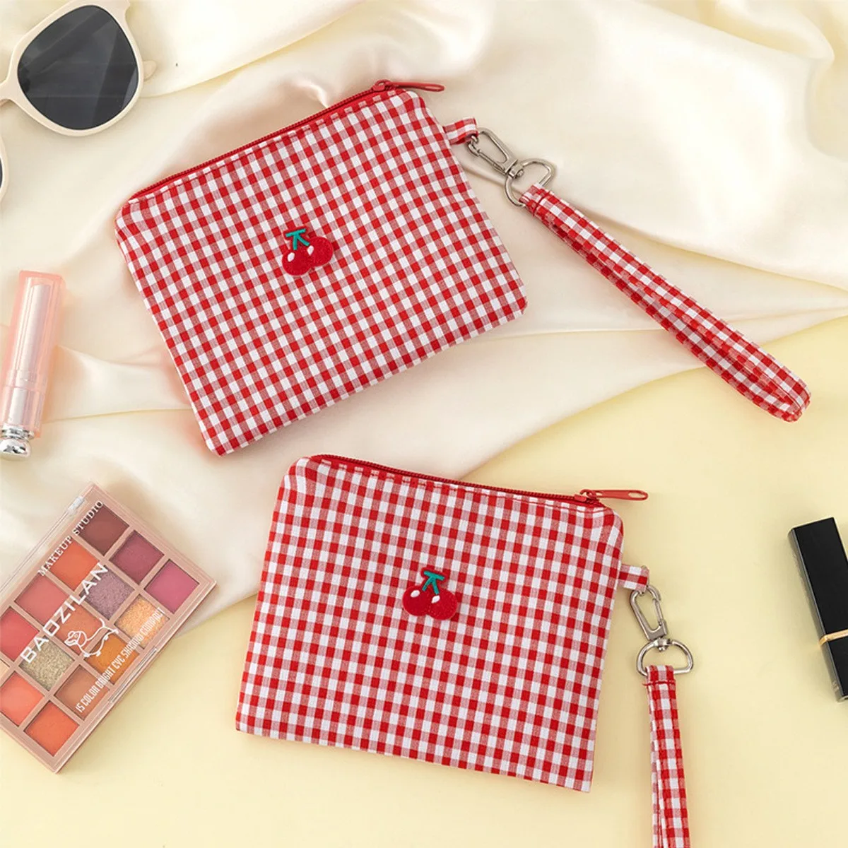 Red cherry canvas lipstick storage bag, portable and easy to carry. Red plaid, large capacity cosmetic makeup bag